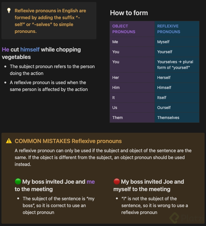 Los pronombres reflexivos son aquellas palabras que utilizamos cuando el sujeto de una oración es el mismo que el objeto. Dicho de una forma más simple, la acción del verbo vuelve hacia el sujeto que la realiza. Por ejemplo, en "she saw herself in the mirror", tanto she (ella) como herself (ella misma) se refieren a la misma persona.