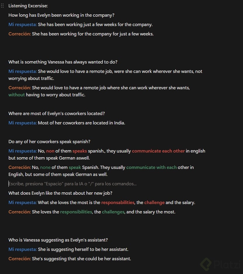Después de escuchar el diálogo, tendrás la oportunidad de revisar tus respuestas y comprender mejor la conversación: