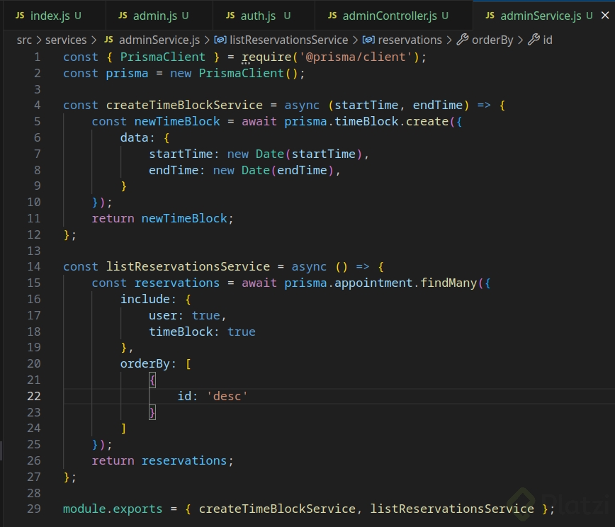 Para implementar la parte administrativa de nuestra aplicación, necesitamos crear un servicio específico que maneje la lógica de negocio relacionada con la gestión de bloques de tiempo y reservaciones. Este servicio actuará como intermediario entre nuestros controladores y la base de datos.
