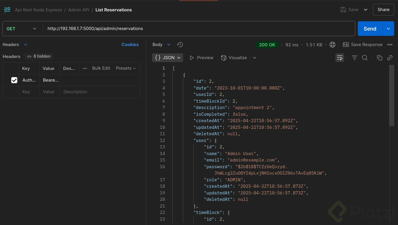 - Listar reservaciones con un usuario administrador: Debería devolver todas las reservaciones con información detallada.