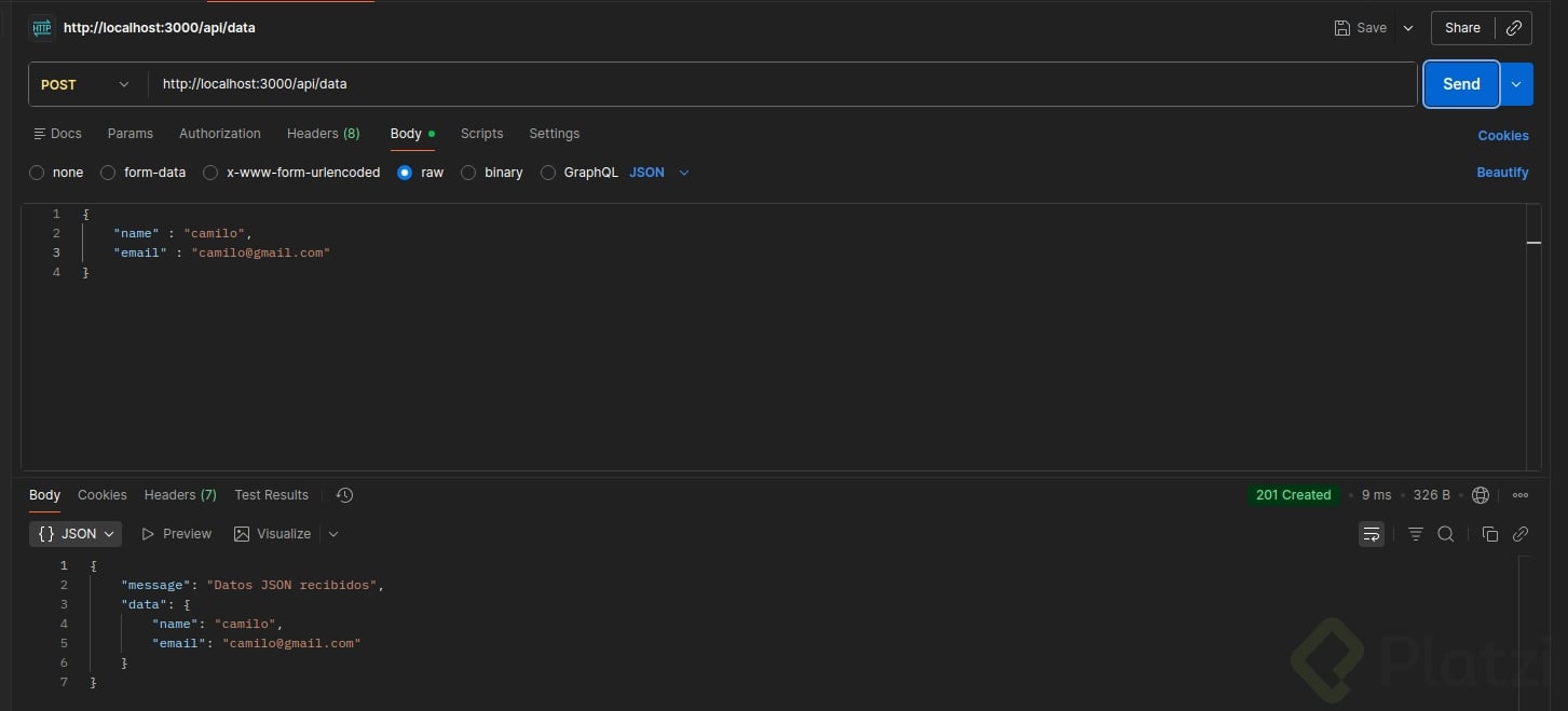 Al enviar esta solicitud, deberíamos recibir una respuesta con código 201 (Created) y un objeto que confirma los datos recibidos.