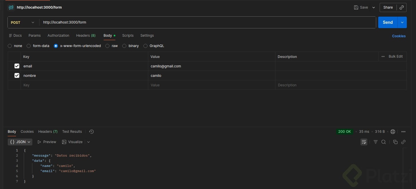 Al probar el endpoint para formularios, es crucial verificar que los nombres de los campos coincidan exactamente con lo que espera tu servidor. En nuestro ejemplo: