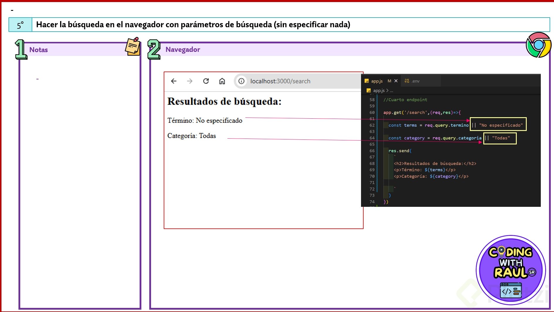 La aplicación extraerá los valores "express js" para el término y "node.js" para la categoría, y los mostrará en la respuesta.