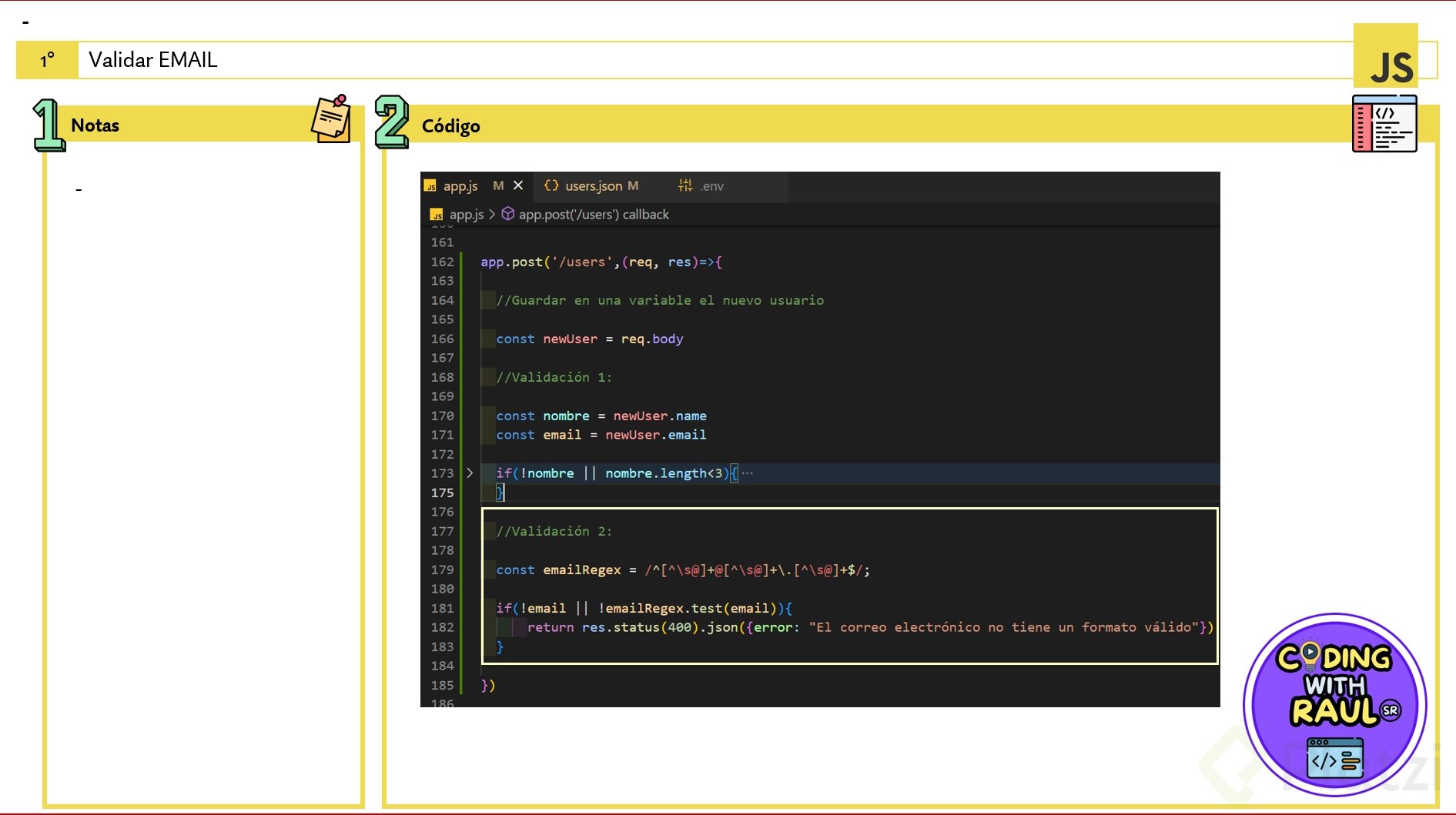 Antes de guardar un nuevo usuario, es crucial validar que los datos recibidos cumplan con nuestros requisitos. Algunas validaciones comunes incluyen: