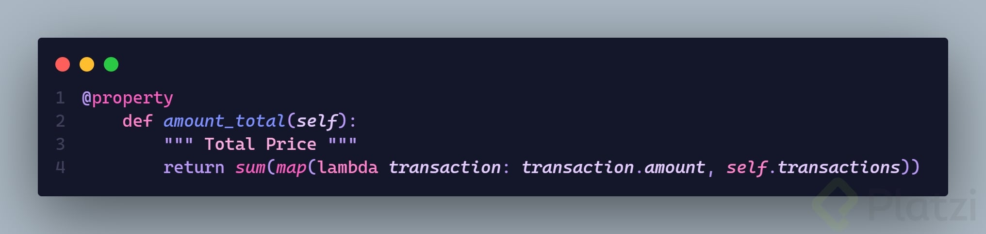amountde cadaTransactionen la listatransactionsmediante una comprensión de listas, retornando el total.