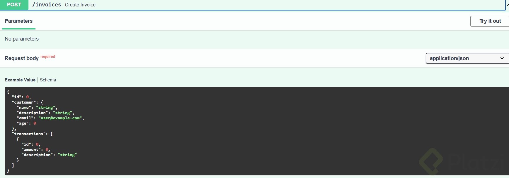 Los modelos se importan al archivo principal (main.py), y se crean nuevos endpoints para gestionar transactions e invoices. FastAPI genera automáticamente la documentación de estos endpoints, mostrando los datos necesarios para crear facturas con un cliente y una lista de transacciones, simplificando el uso de la API para el usuario final.