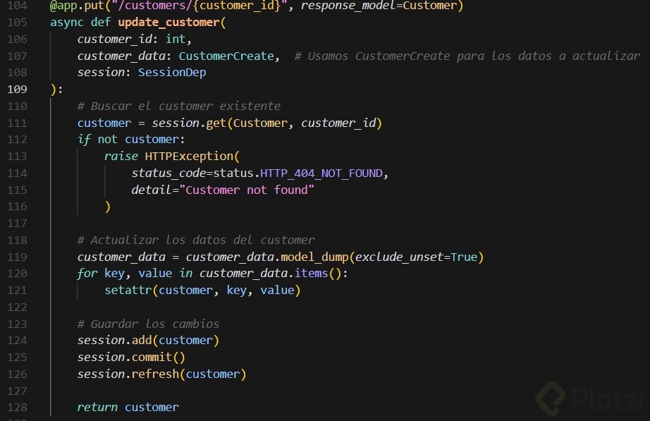 putopatchpara actualizar. Se recibe elcustomer_idy el objeto con los nuevos datos, excluyendo el ID. - Validación y Actualización: Como en los otros endpoints, verifica que el cliente exista. Luego, actualiza los campos necesarios en el objeto del cliente.