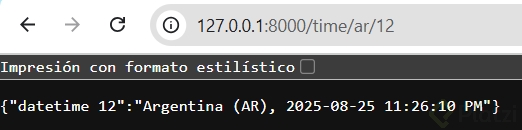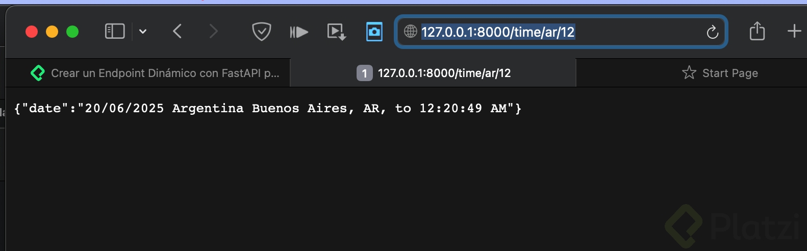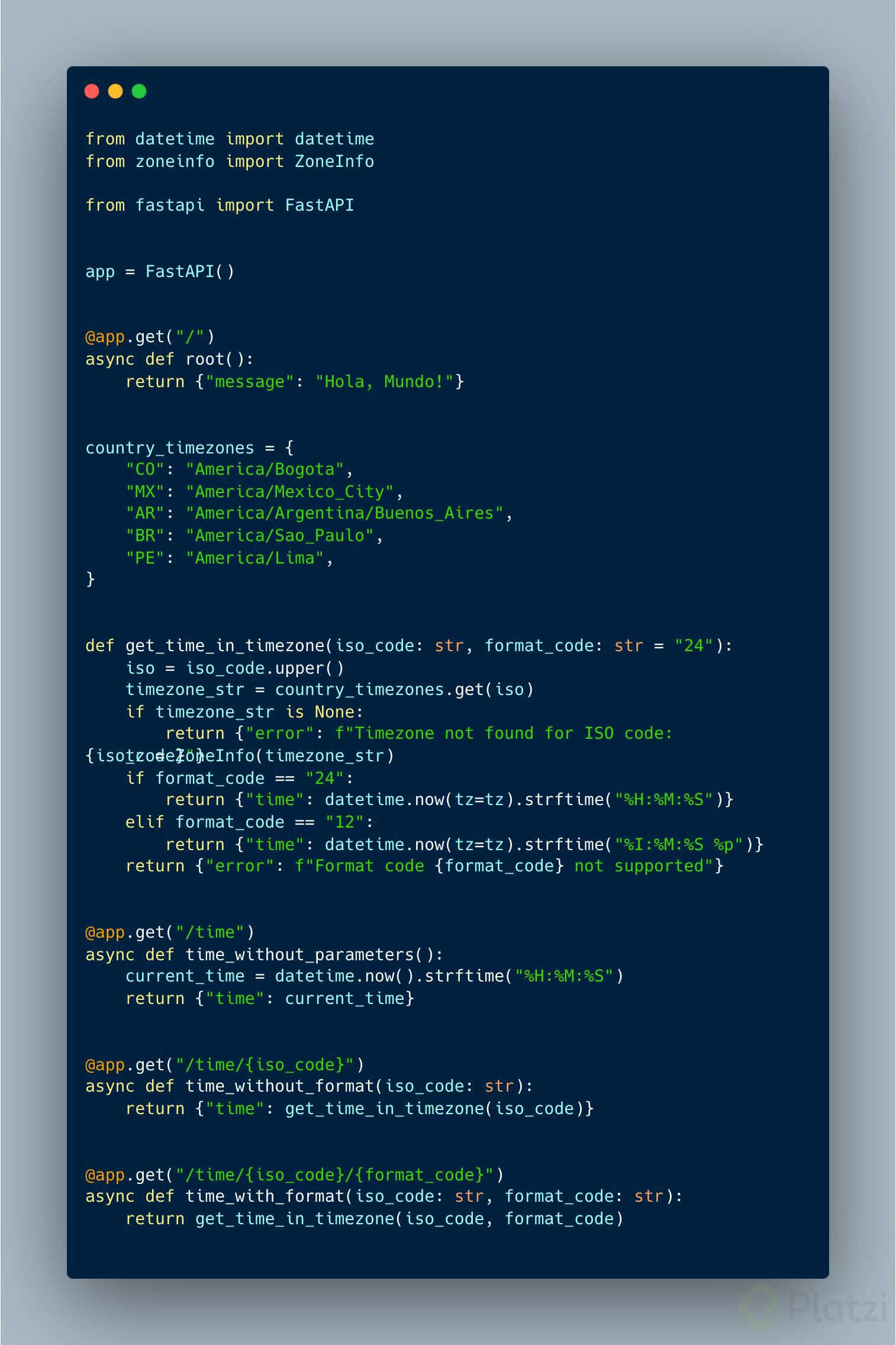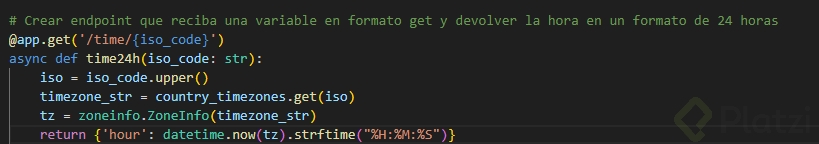 Un endpoint estático es poco común en aplicaciones que requieren personalización. FastAPI permite recibir variables directamente en la URL, por lo que podemos modificar el endpoint para que acepte un código de país y devuelva la hora correspondiente en ese huso horario.