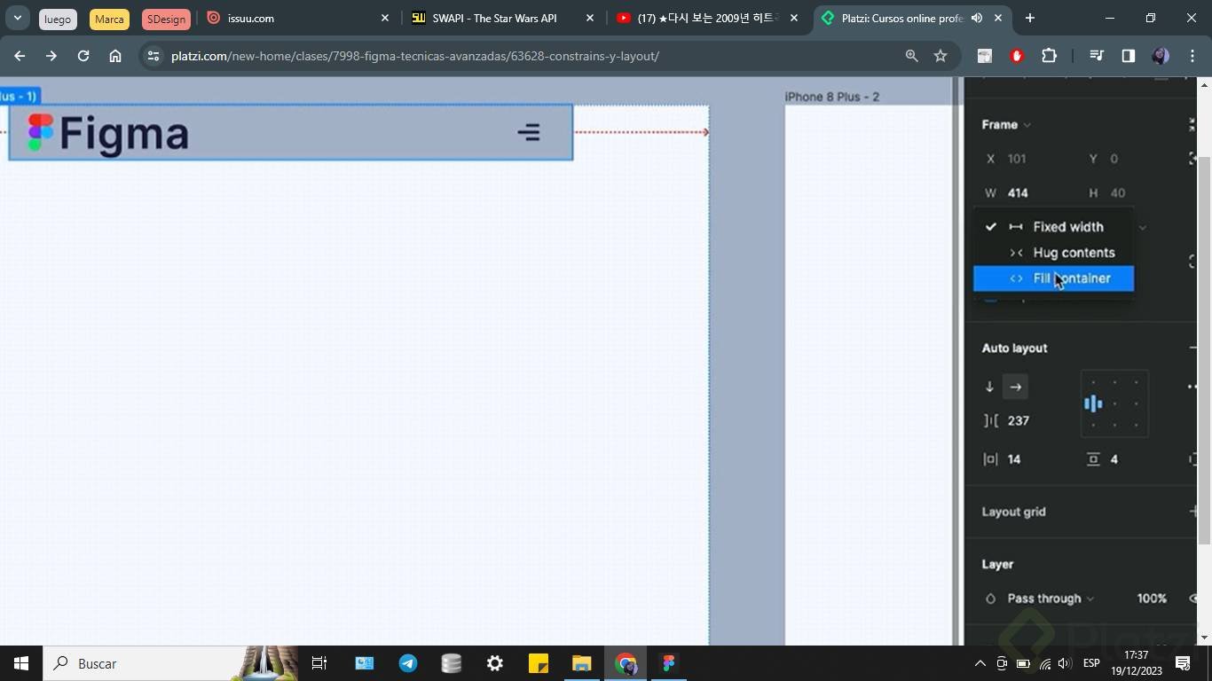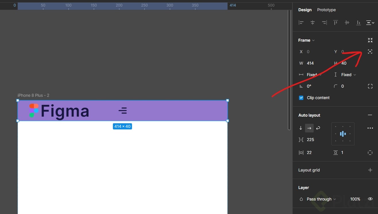 Activar autolayout: Esto se hace desde la barra lateral derecha en Figma. Al activarlo, el diseño puede cambiar de tamaño, pero podemos ajustarlo para que mantenga un ancho fijo de 414 píxeles.