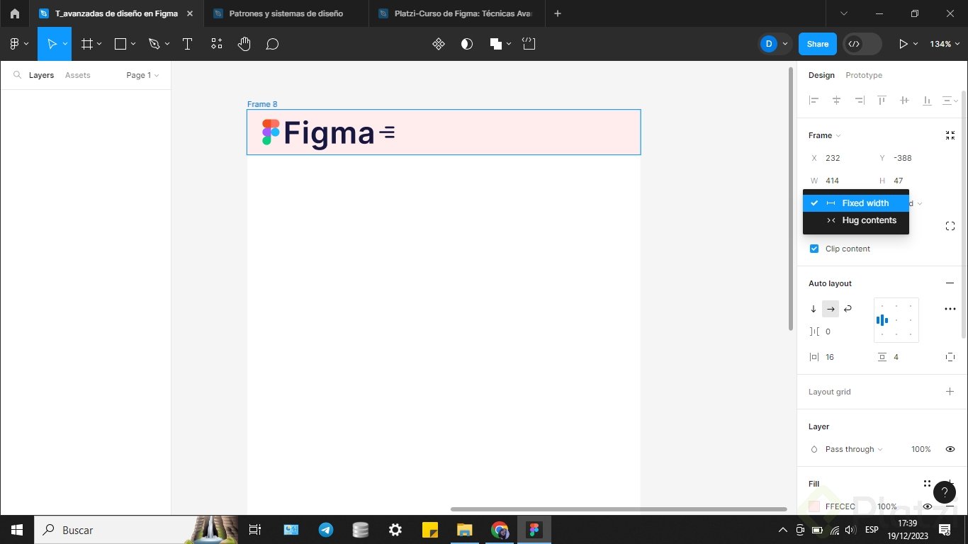 Utilizar autolayout en Figma proporciona automatización en el comportamiento del diseño. Una vez incluido el logo y el icono en el frame, pueden seguir los siguientes pasos: