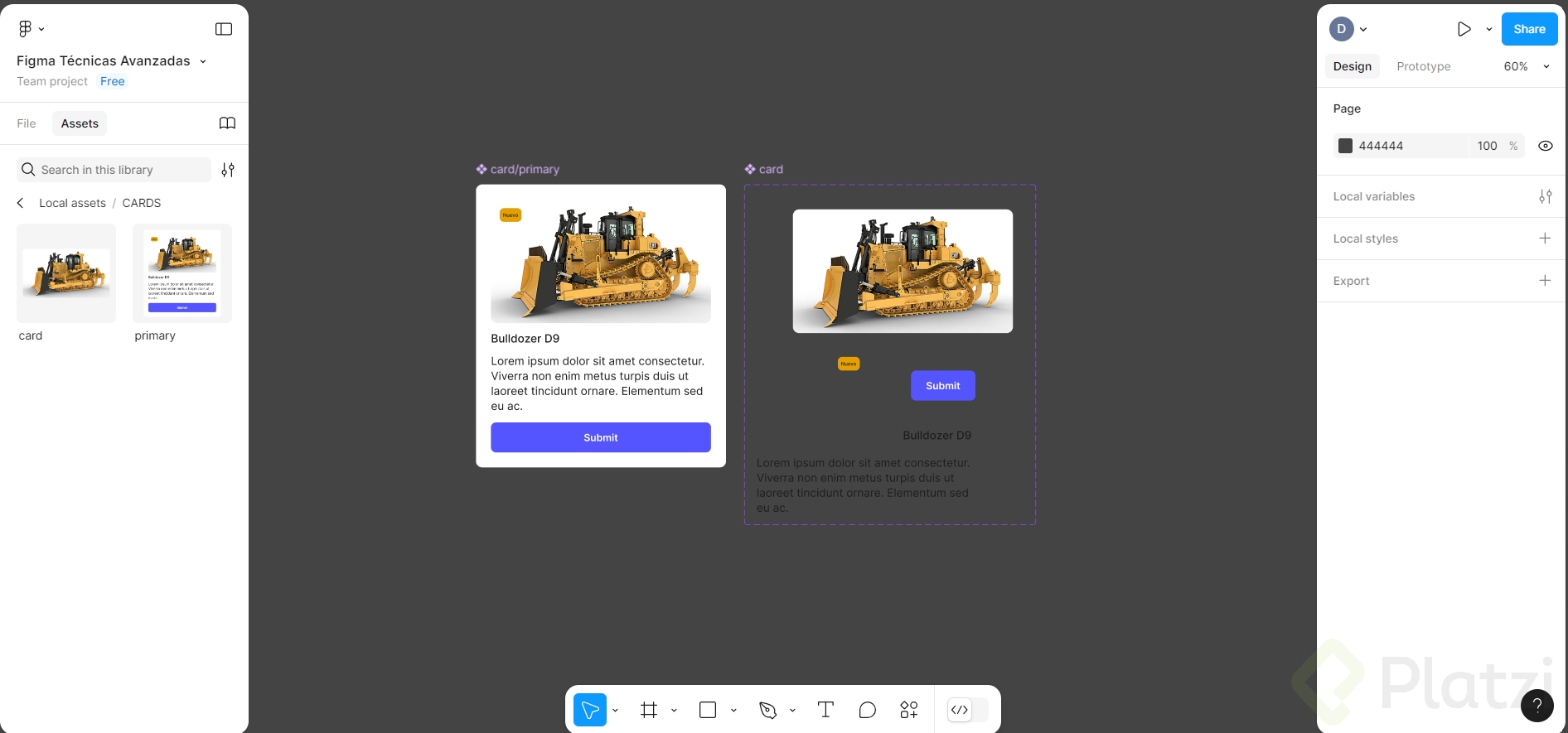 Creación de Variants: Puedes transformar un conjunto de componentes en un grupo de variants desde el panel de propiedades. Una vez agrupados, Figma los considera como parte de un componente mayor.
