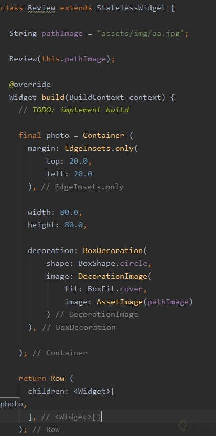 Una vez declarado el recurso de imagen en el archivo de configuraciones, lo incorporamos al código mediante el widget AssetImage( “ que a su vez colocaremos como valor de la propiedad image de un widget DecorationImage, o de cualquier otro widget que disponga de la propiedad image, como es el caso del BoxDecoration.
