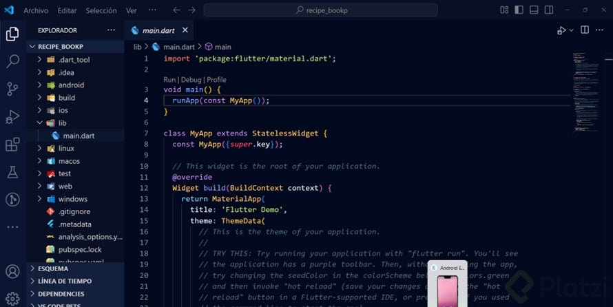 androidyios: Contienen configuraciones específicas para cada plataforma.lib: Aquí se desarrolla el código principal de tu aplicación.test: Diseñada para pruebas unitarias.assets: Almacena imágenes y fuentes personalizadas.