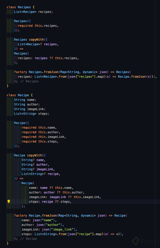 Recipeque contenga los atributos necesarios:name(String): el nombre de la receta.author(String): el autor de la receta.imageLink(String): enlace a la imagen.steps(List): pasos de la receta en forma de lista.