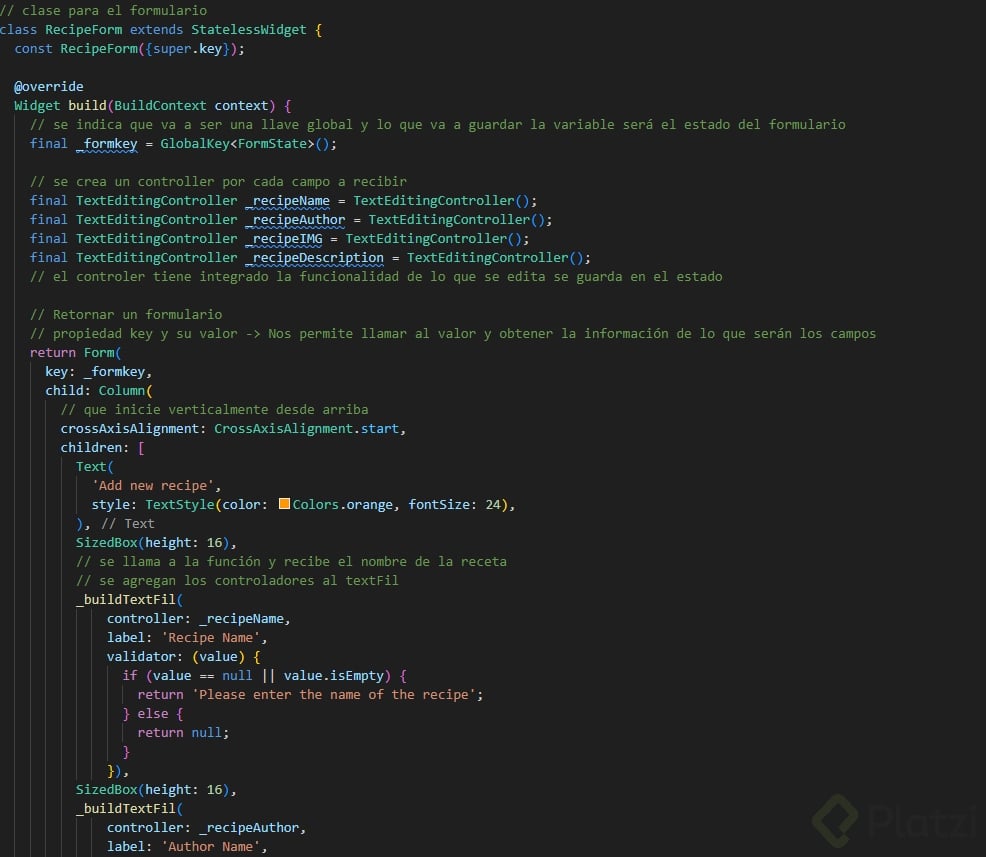 TextEditingControllerque permite capturar y almacenar los datos ingresados. - La estructura base incluye etiquetas (