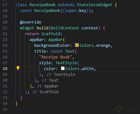 StatelessWidget. Por ejemplo:class RecipeBook extends StatelessWidget { @override Widget build(BuildContext context) { return Scaffold(); } }Scaffoldactúa como una hoja en blanco donde añadimos elementos.