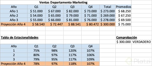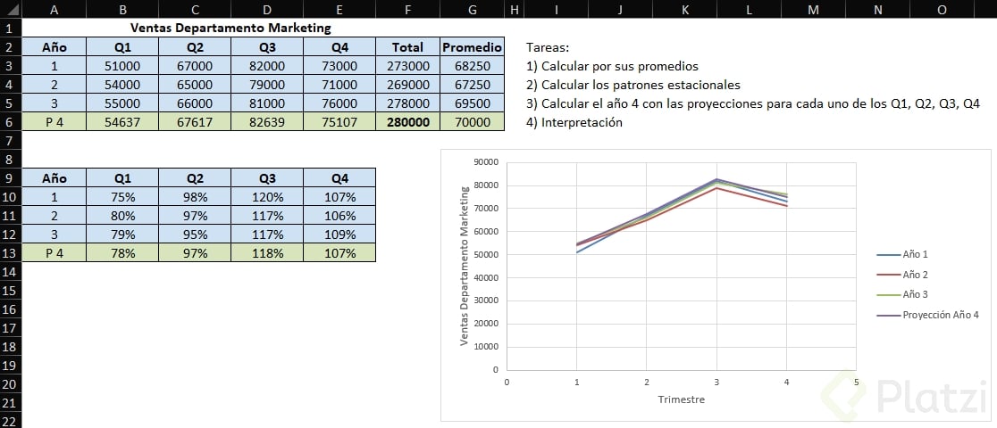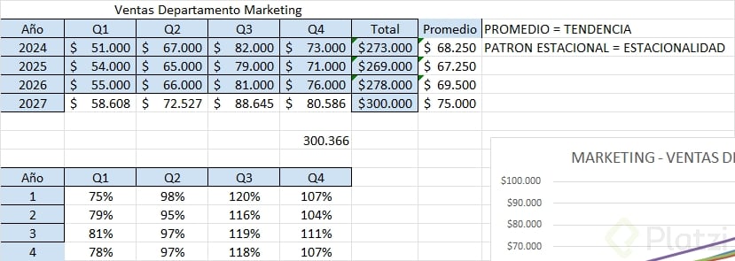 - Multiplicar la tendencia (promedio calculado) por el patrón estacional correspondiente.