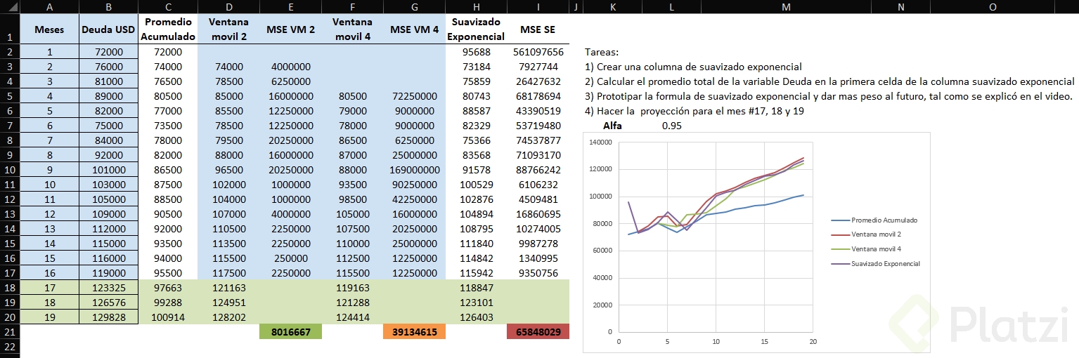 - Promedio inicial: La primera observación del suavizado exponencial debe basarse en el promedio de todas las observaciones reales.