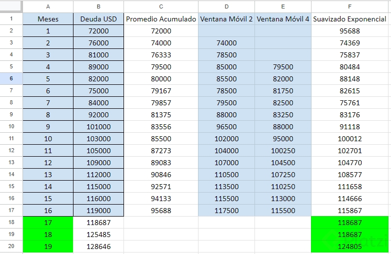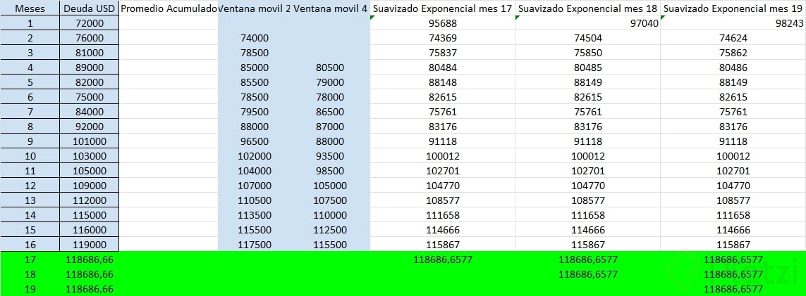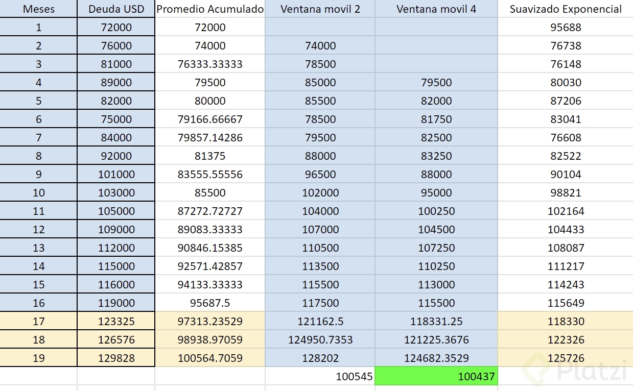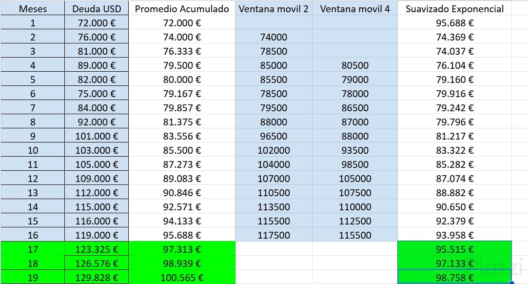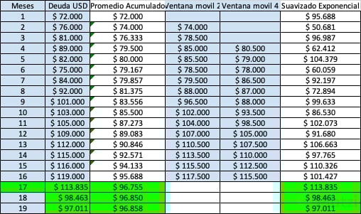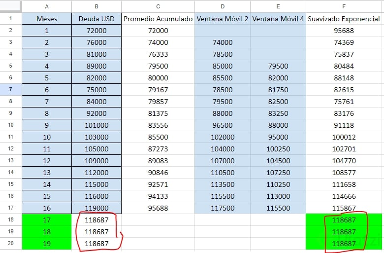 Esta fórmula se ajusta fácilmente con un pequeño arrastre, permitiendo estimar el próximo periodo, como el mes 17 en nuestro caso de ejemplo.