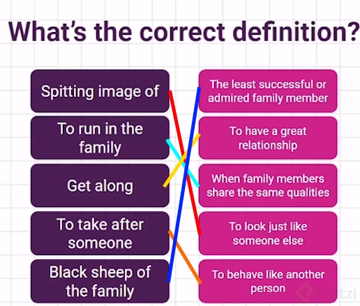 ¿Alguna vez te han dicho que tienes una característica que "corre en la familia"? Esta expresión, to run in the family, se usa para describir cualidades o características que varios miembros de una familia comparten. Por ejemplo, si varias personas en tu familia tienen un excelente sentido del humor, podrías decir que el sentido del humor corre en tu familia. También podrías mencionar el cabello rojo, si es una característica común entre tus parientes.