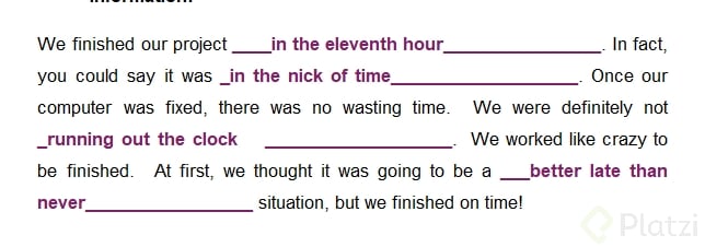 - Escuchar y completar: Una manera efectiva de practicar es escuchar una historia o un guion donde se utilicen estos idioms y completarlos mientras escuchas. Intenta llenar los espacios en blanco con el modismo correcto.