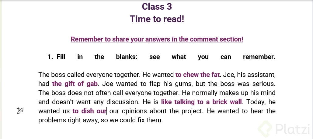 En la historia narrada, el jefe convocó a todos para discutir un proyecto. A diferencia de su estilo habitual, esta vez estaba interesado en escuchar opiniones y resolver problemas de inmediato. Sin embargo, su asistente, Joe, tenía un enfoque diferente, deseando simplemente charlar informalmente. Durante el relato, se utilizaron varios idioms, los cuales son cruciales para comprender la dinámica y el tono de la situación.