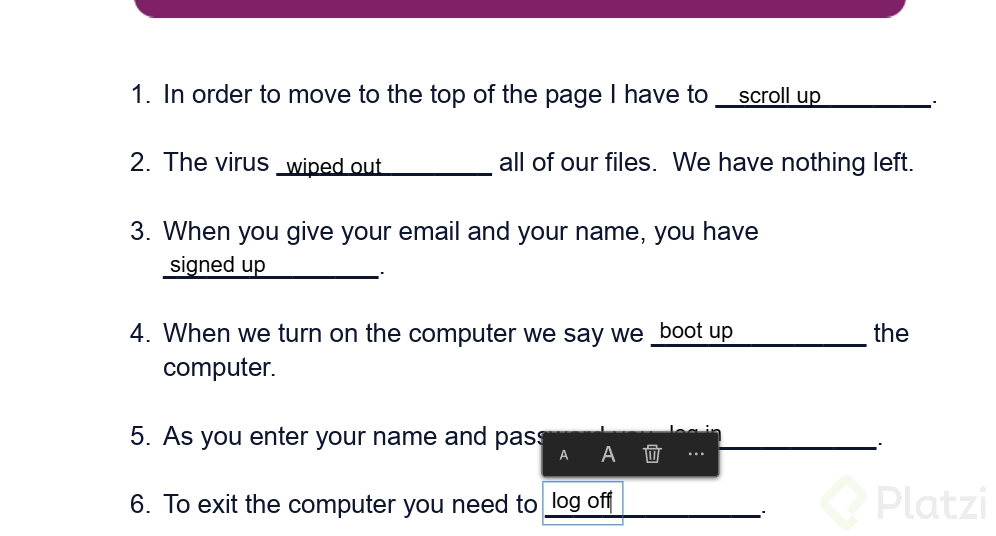 Por otro lado, log out o log off significa salir del sistema, asegurando que tu información se mantenga segura cuando no estés en el dispositivo. Una situación típica podría ser: "Don't forget to log off from the computer before you leave the office today".