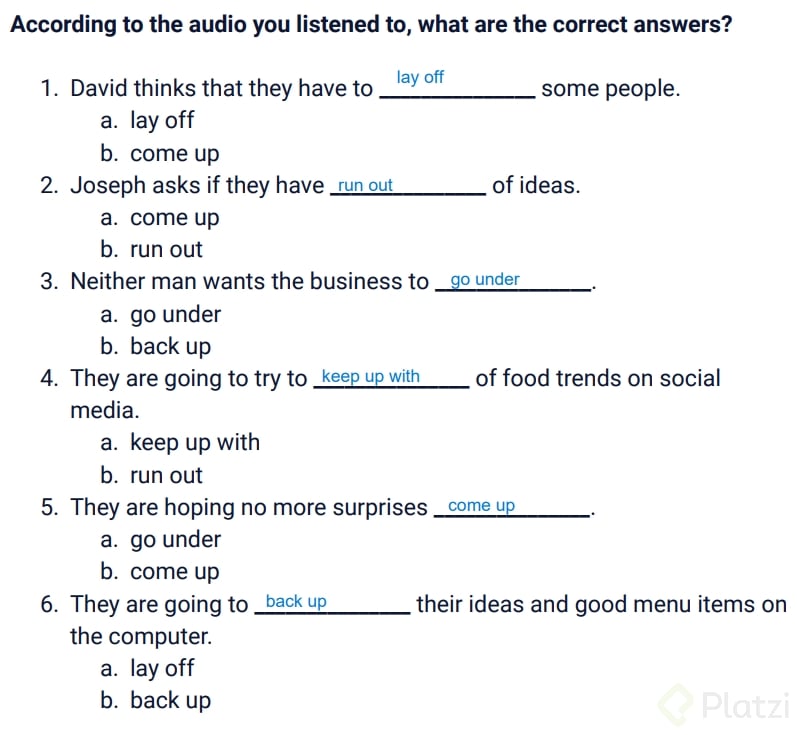 La actividad auditiva te invita a escuchar un diálogo cuidadosamente diseñado para que identifiques frases verbales en inglés. Estas frases son expresiones comunes que, a menudo, no tienen un significado literal, pero son esenciales para la comunicación cotidiana. Escucharás ejemplos como: