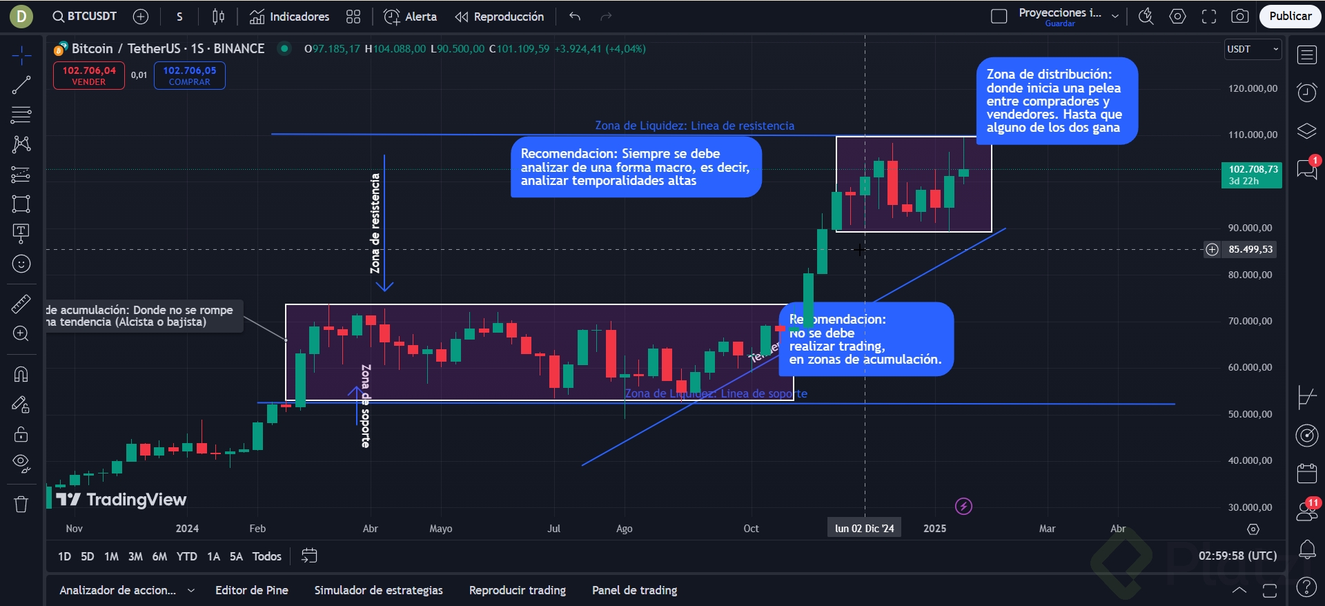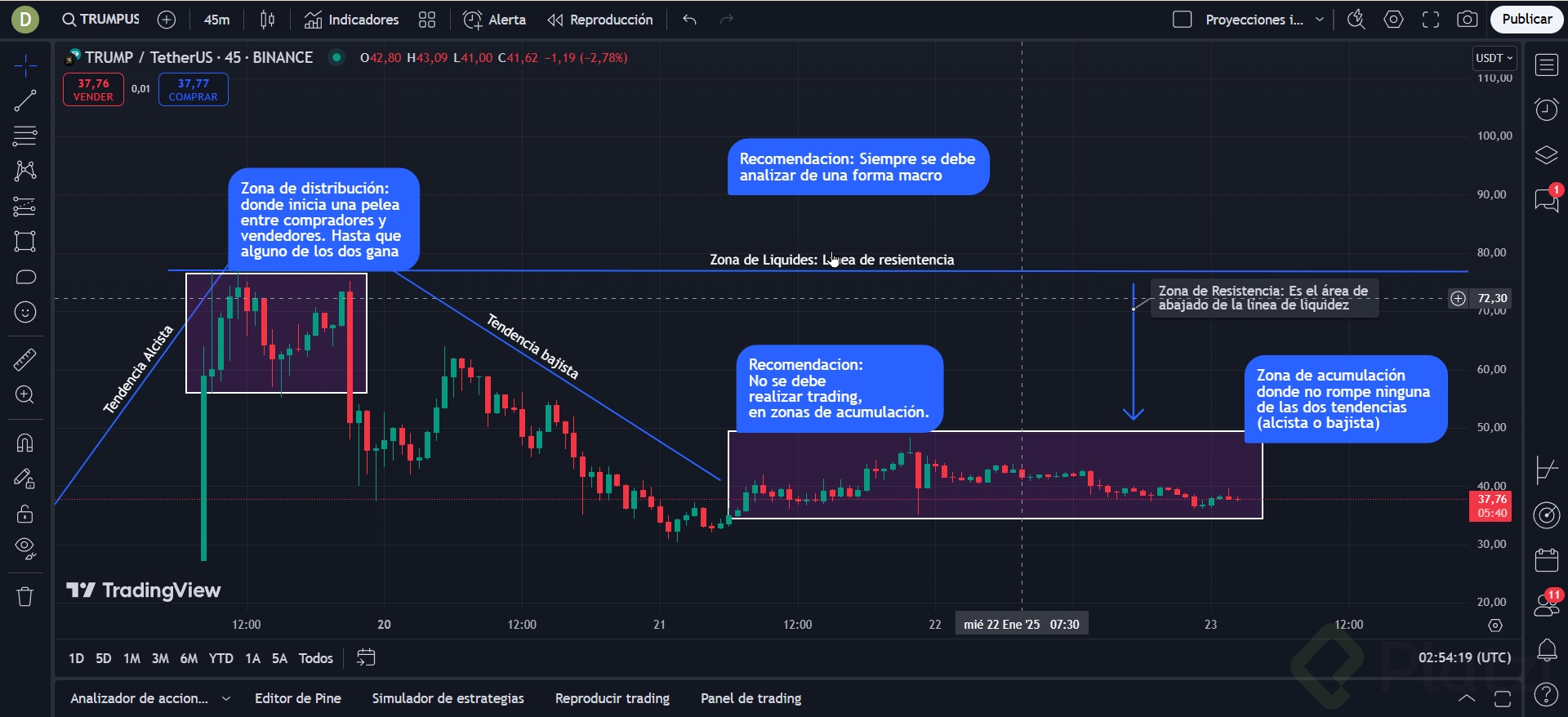 - Resistencias: Se producen cuando el precio cae por debajo de una zona de liquidez anterior.