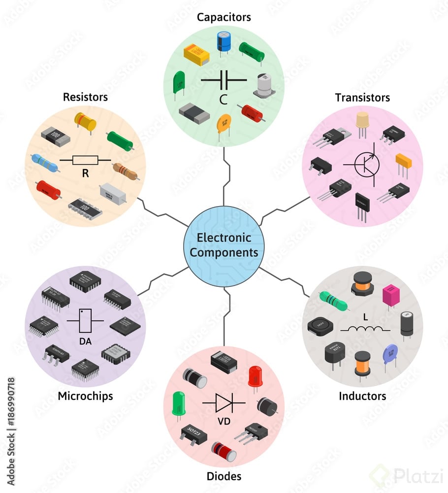 Transistores: Funcionan como interruptores que se accionan accionado mediante un voltaje pequeño, que cierra el circuito y permite el paso de electricidad. Se compone de tres elementos: colector, base y emisor(siendo la base la encargada de cerrar el circuito).