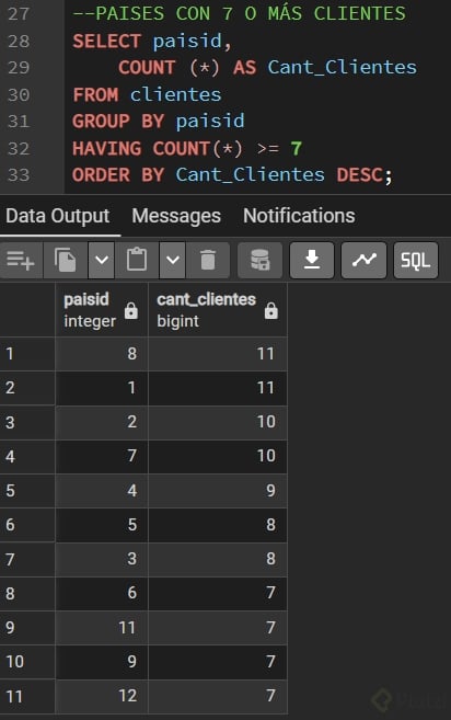 Ahora se aplica el filtro posterior con HAVING [2:25]: