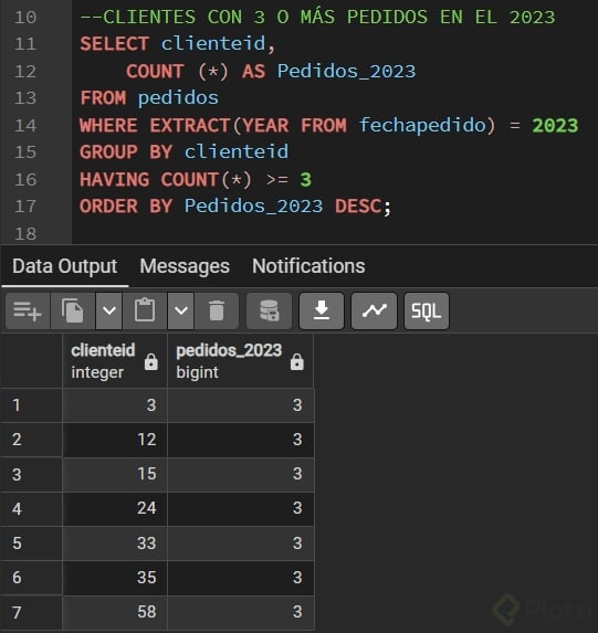 Al ejecutar la consulta completa, el resultado muestra únicamente al cliente 100 y al cliente 81, que son los únicos que superaron tres pedidos en 2024.