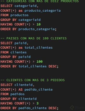 Pon a prueba lo aprendido con estos tres ejercicios sobre Tienda Latam: categorías con más de diez productos, países con más de cien clientes y clientes con más de tres pedidos. Comparte tus resultados en los comentarios.