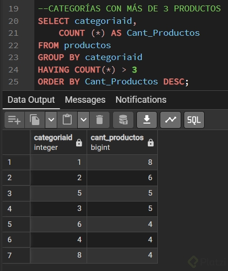 Este resultado devuelve ocho filas mostrando cuántos productos tiene cada categoría: cinco, cuatro, seis, tres, ocho, entre otros valores. Hasta aquí solo hay una función de agregación (COUNT) combinada con GROUP BY.