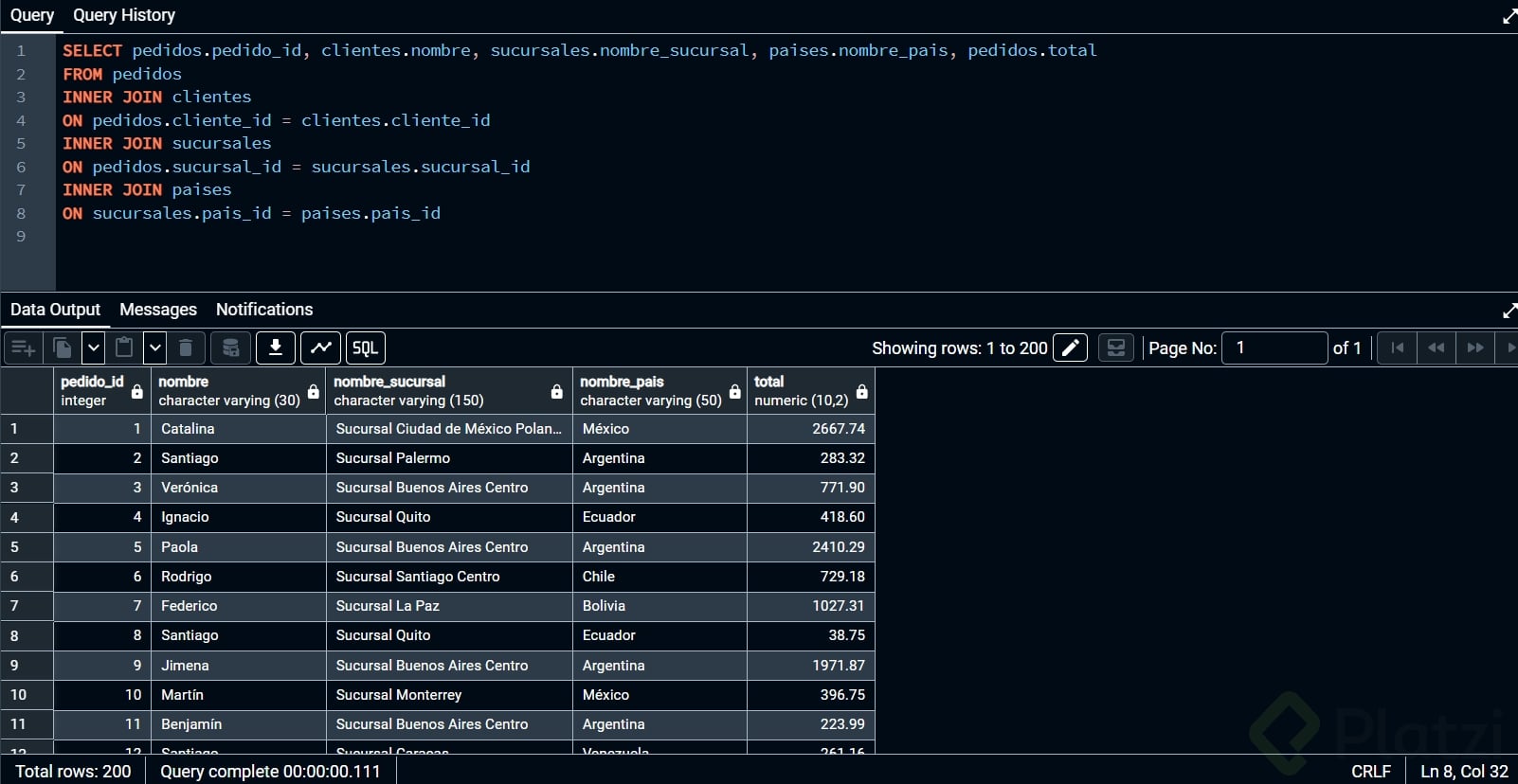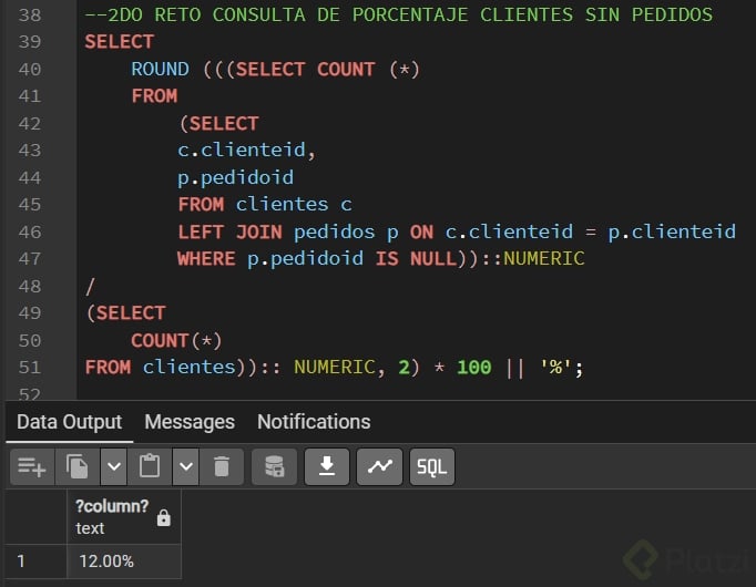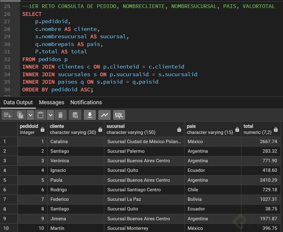 Pon en práctica lo aprendido con estos dos retos: primero, construye un inner join que cruce cuatro tablas mostrando pedido, cliente, sucursal, país y total. Segundo, usa left join para contar cuántos clientes nunca hicieron un pedido y calcula qué porcentaje representan. Comparte tus resultados en los comentarios.