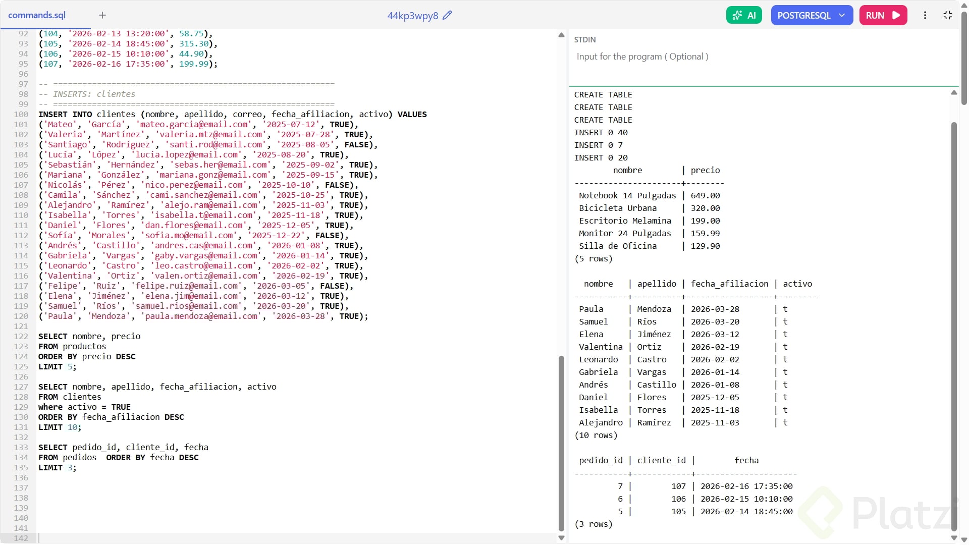 Ahora que dominas ORDER BY, LIMIT y OFFSET, pon a prueba tus habilidades: busca los cinco productos más caros del catálogo, los diez clientes registrados más recientemente y los últimos tres pedidos por fecha descendente. Comparte tus consultas y resultados en los comentarios.