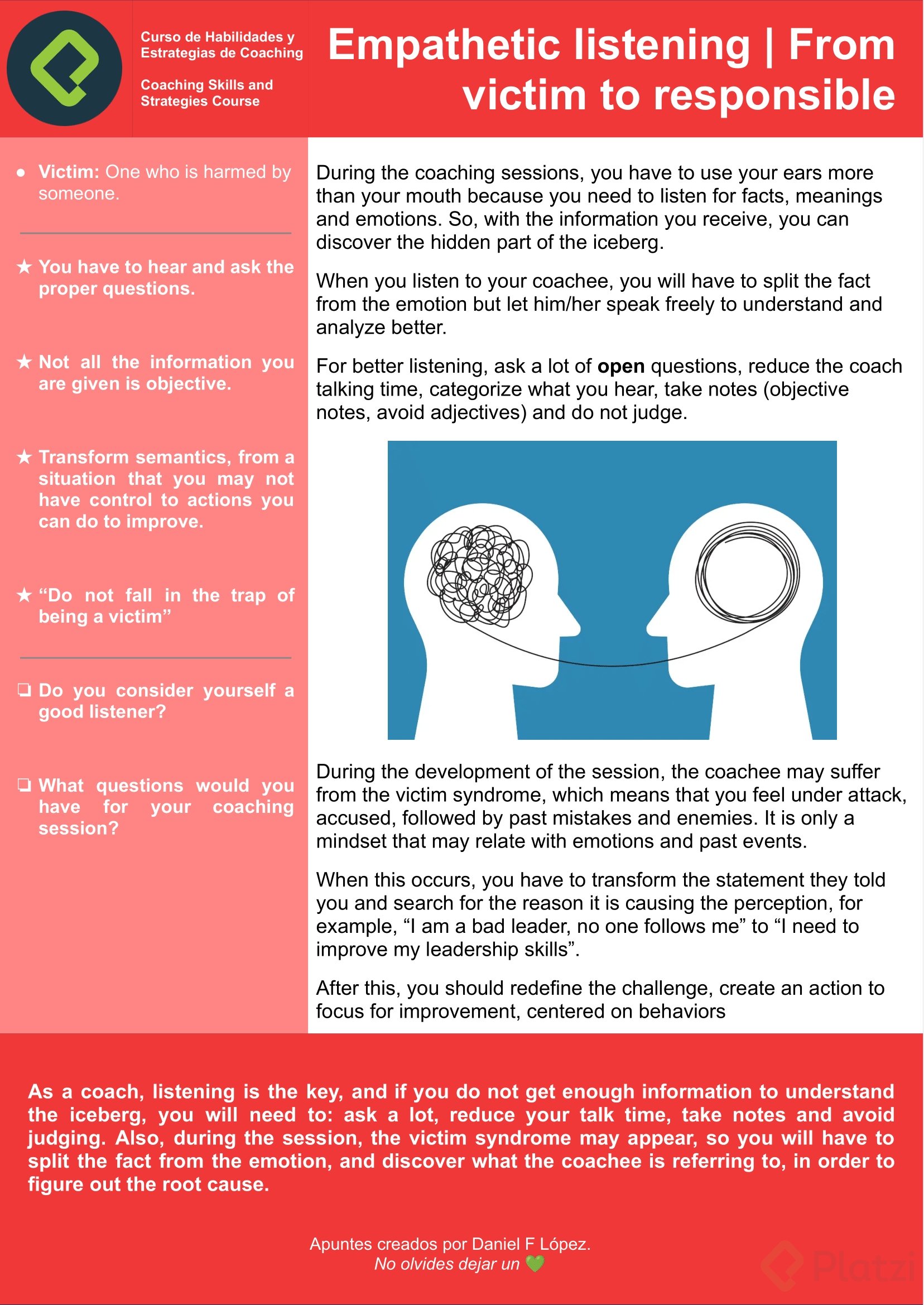 El desafío real está en no volver a caer en la victimización. Como coach, tienes el poder de guiar a tu cliente para centrarse en las acciones y mantenerlos alejados de la autocompasión. No olvides: