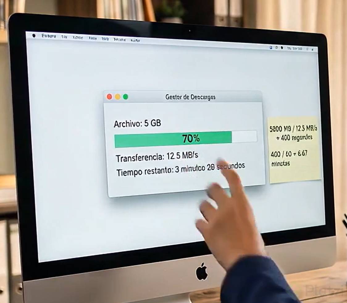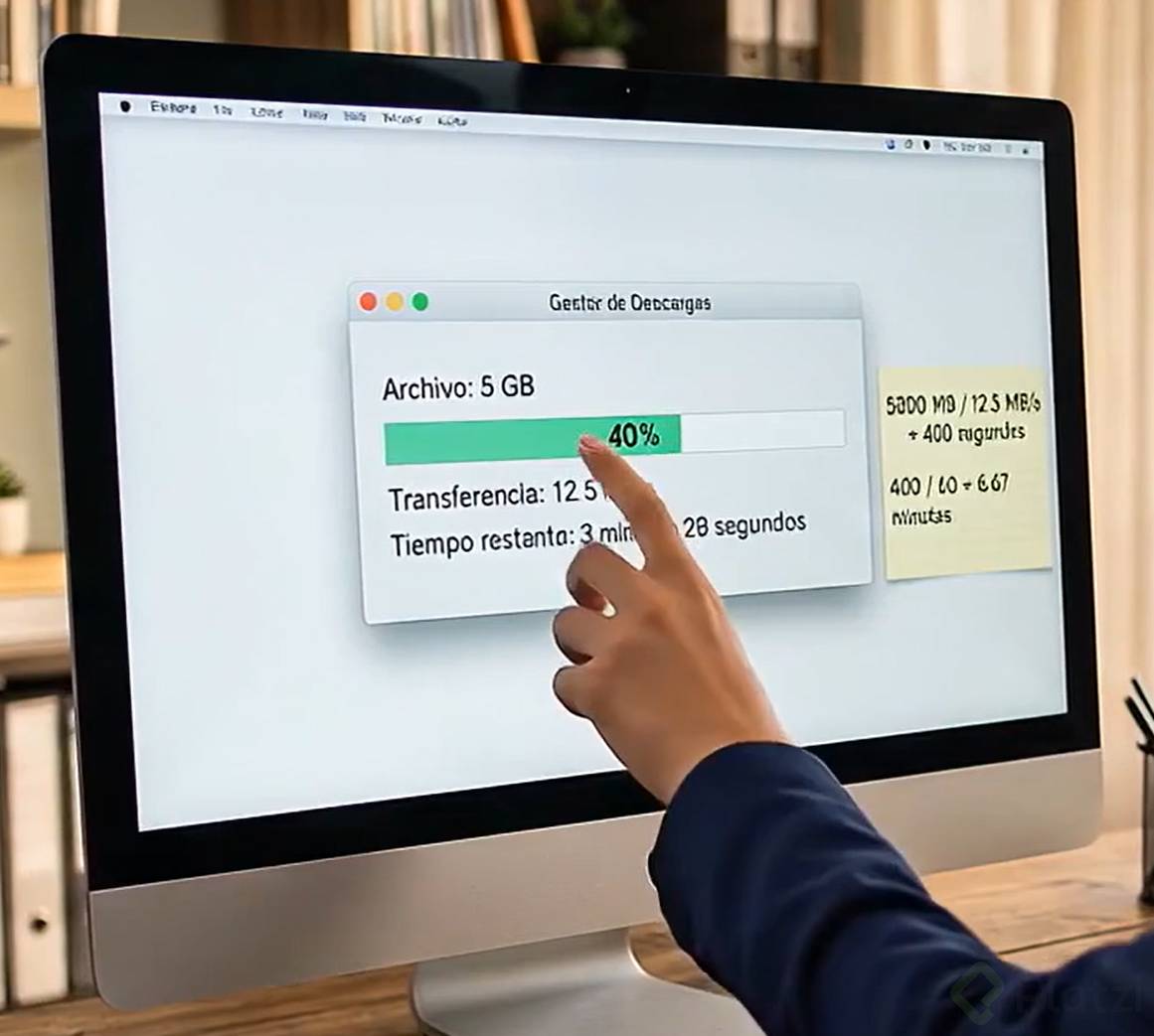 La publicidad habla en bits, tus archivos pesan en bytes. Un byte tiene ocho bits, así que debes dividir entre ocho la velocidad anunciada para conocer tu máximo en megabytes por segundo. Con cien megas, verás alrededor de 12.5 MB/s en el gestor de descargas. Con esa tasa, bajar 5 GB toma unos 400 segundos, es decir, casi 7 minutos.