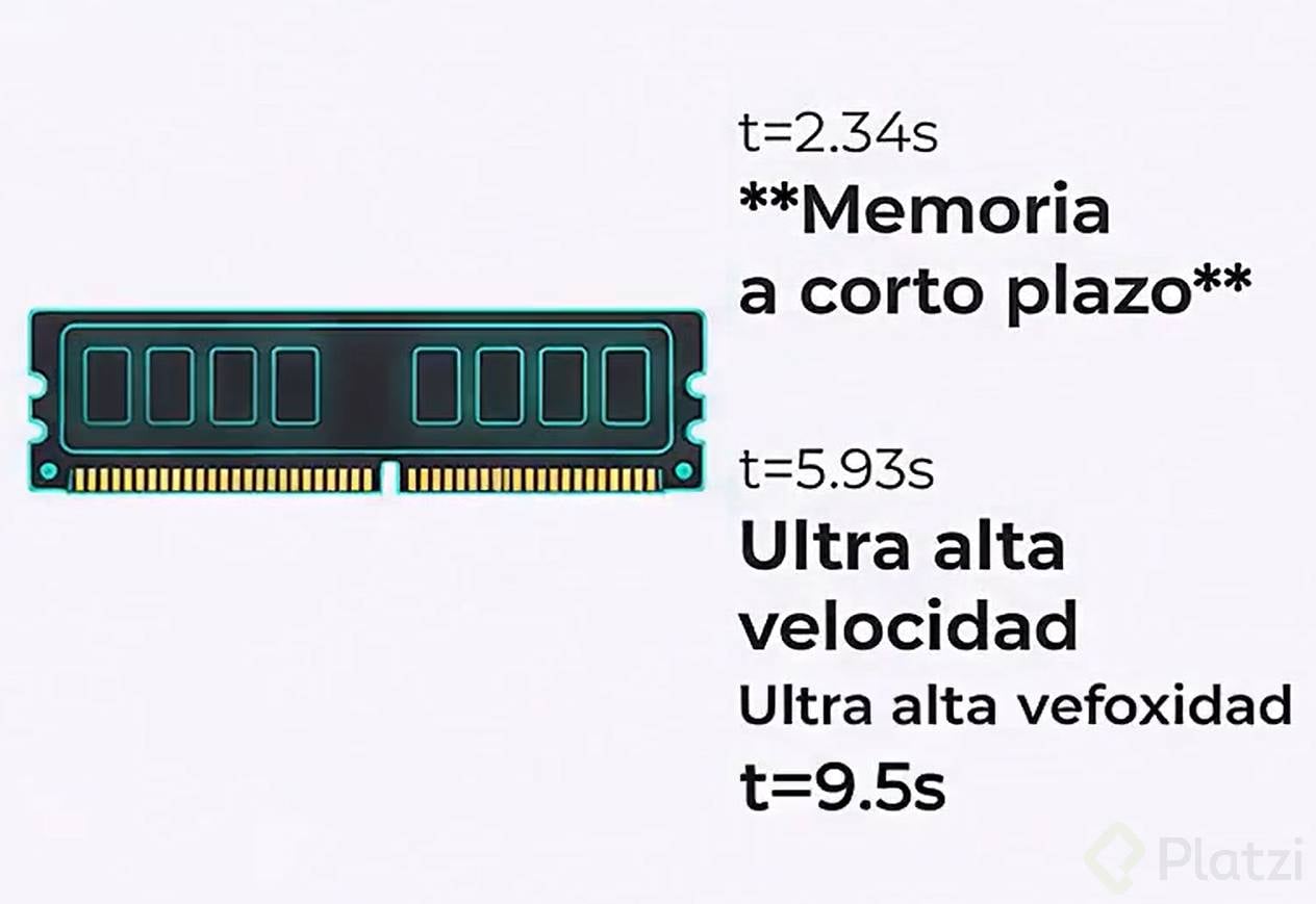 La memoria de acceso aleatorio (RAM) es la memoria a corto plazo del sistema. Es el espacio de trabajo de ultraalta velocidad donde el procesador coloca los datos que usa en ese momento. A diferencia del almacenamiento, es volátil: sin energía, se vacía al instante. En la analogía de cocina, la CPU es el chef y la RAM es la mesa de preparación donde se corta, mezcla y cocina lo actual.