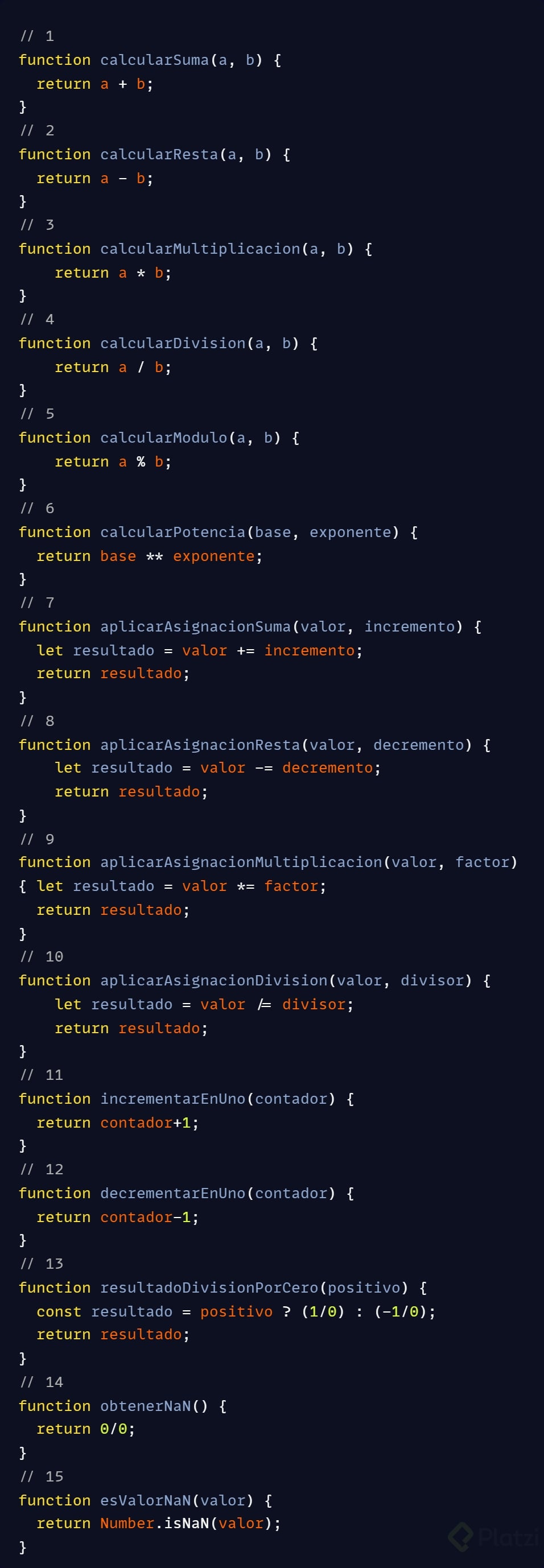let contador =0;contador++;// incrementa en 1console.log(contador);// 1contador--;// decrementa en 1console.log(contador);// 0
