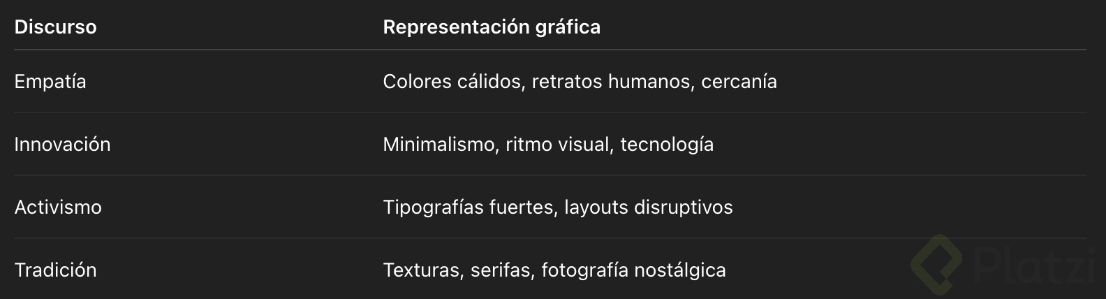 El discurso y el mensaje no son solo palabras vacías, sino componentes esenciales en el diseño y la dirección de arte, donde las representaciones visuales y verbales se entrelazan de manera poderosa. Al considerar estos elementos, es crucial entender que reflejan la personalidad de una marca o un cliente. Todo lo que se dice y se muestra está cargado de los atributos y valores de la marca. Similar a cómo nuestro propio discurso refleja quiénes somos, las marcas se manifiestan a través de sus gráficas. Es fundamental reconocer que lo que dicen va más allá del ámbito comercial y puede impactar áreas sociales en un mundo hiperconectado. Así, las marcas deben ser conscientes de su postura y cómo la comunican visualmente.