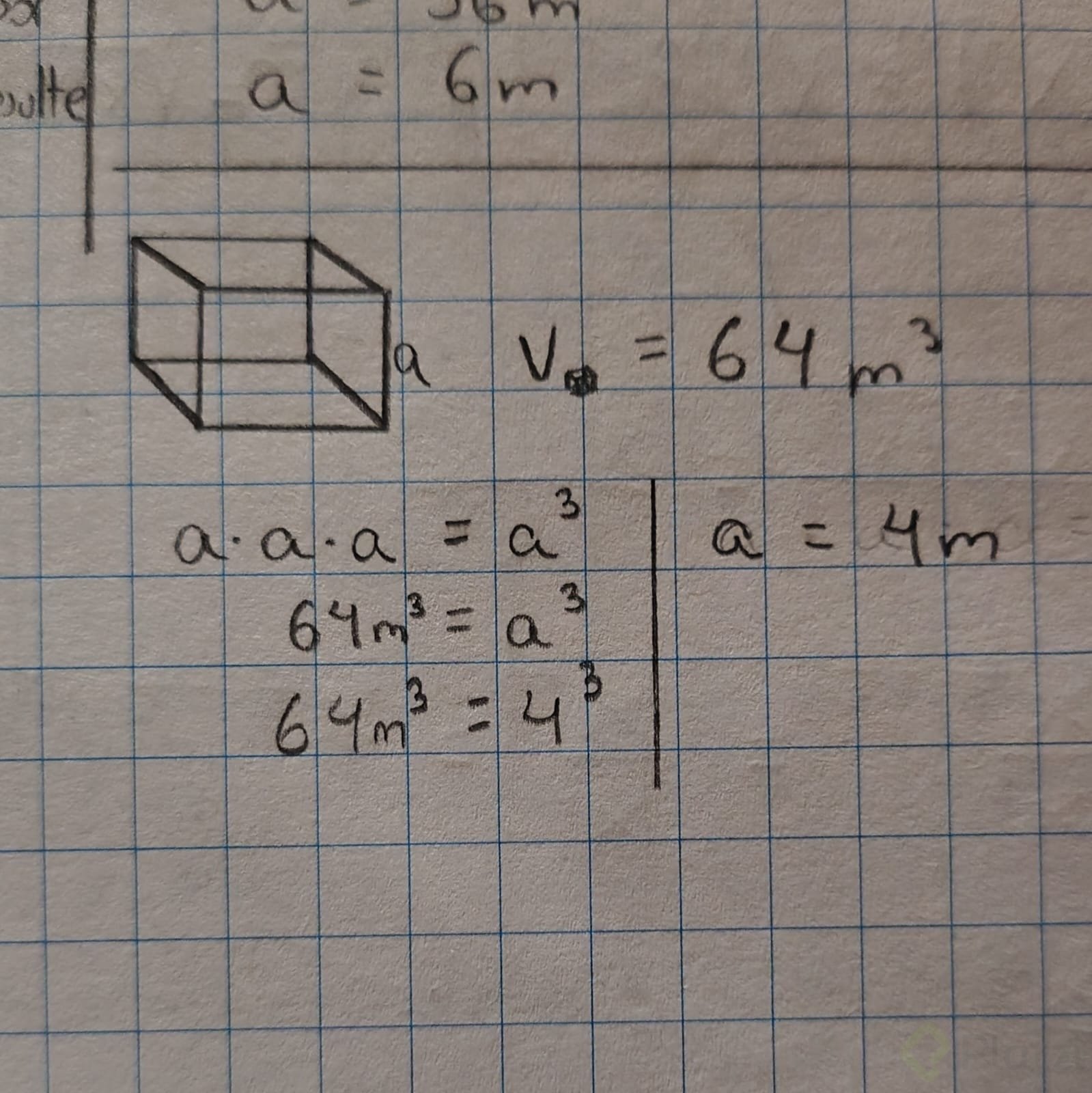 Considerando ahora un cubo cuyo volumen es 64 m³, el desafío es aplicar la raíz cúbica para descubrir la longitud de sus aristas. Para resolver este problema, necesitamos encontrar el número que multiplicado tres veces por sí mismo dé exactamente 64.