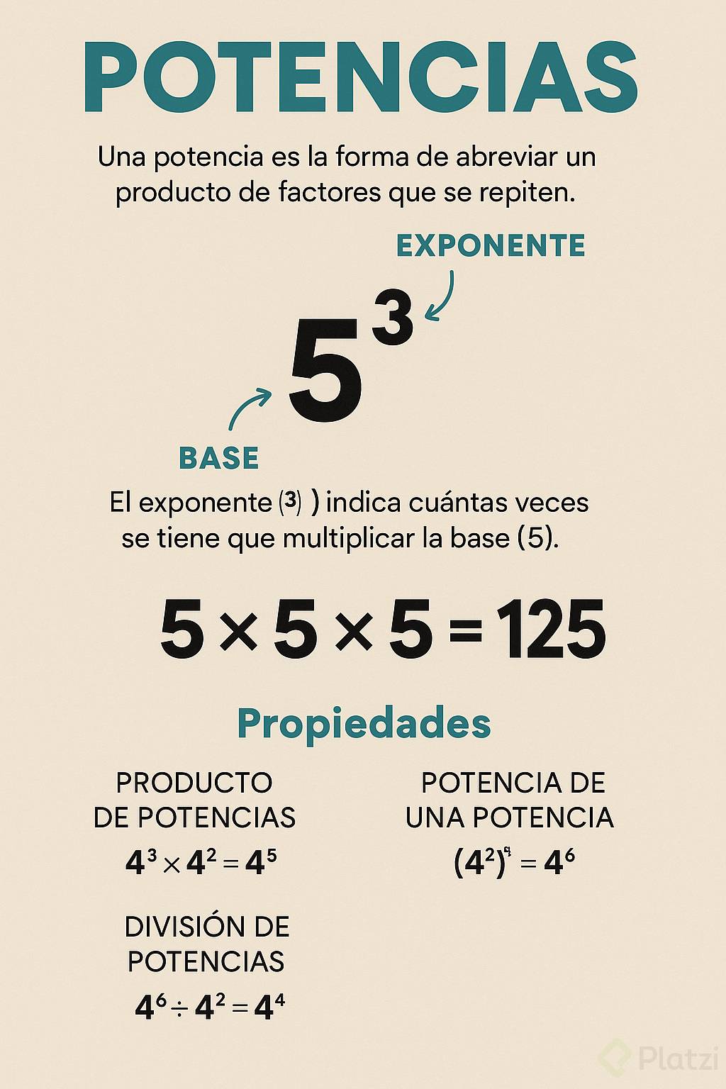 Las potencias cumplen reglas fundamentales que ayudan a resolver expresiones complejas.