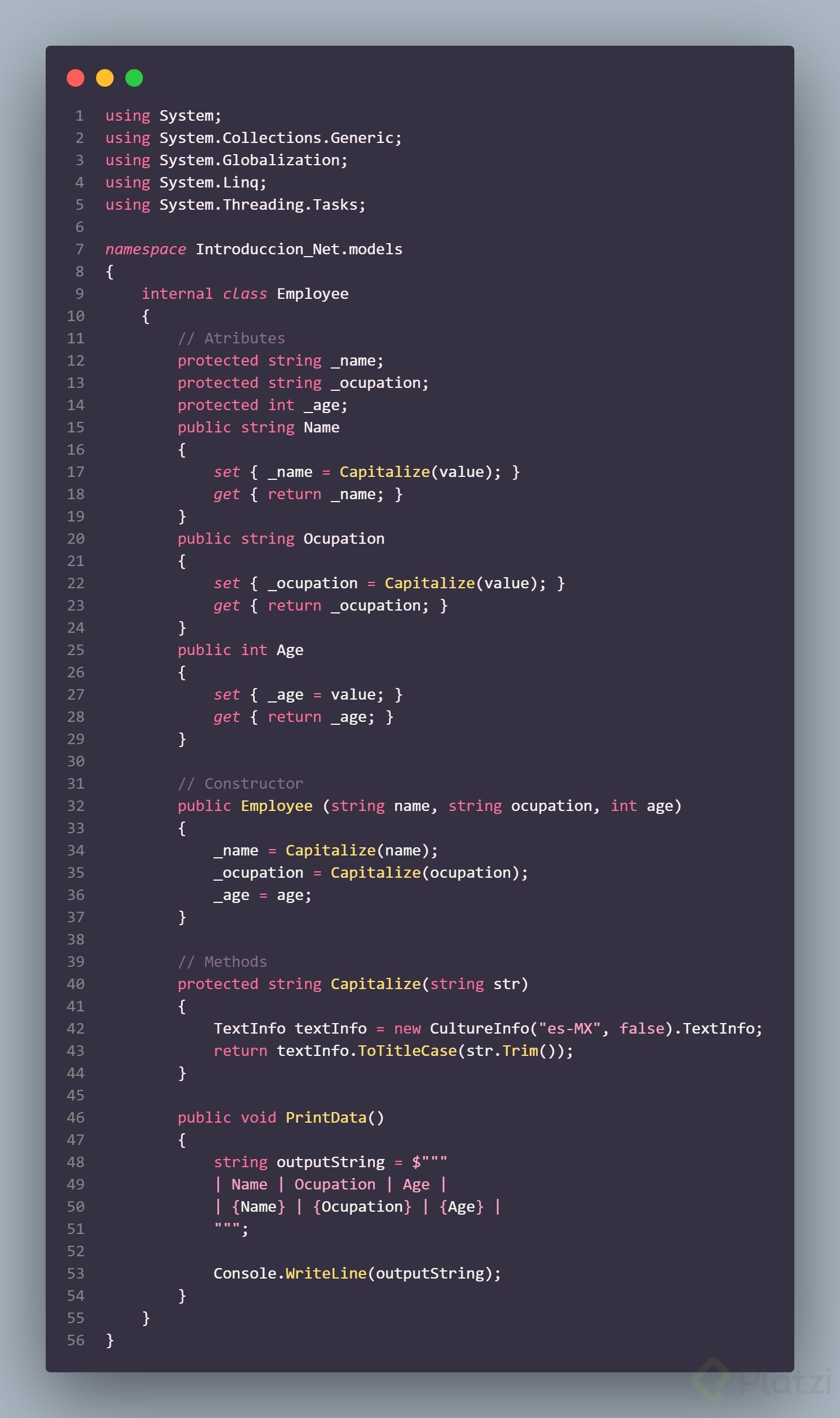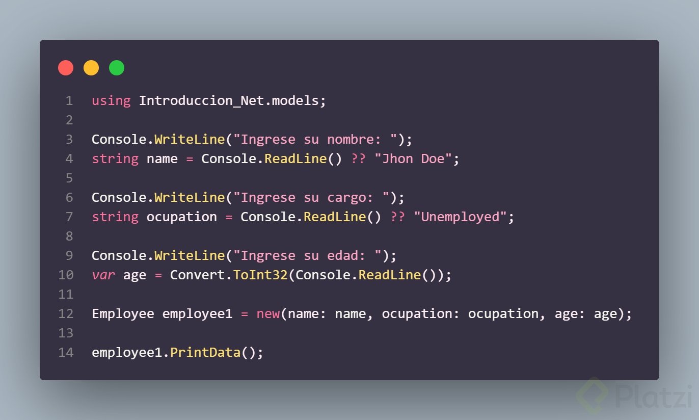 Console.ReadLinepara guardar cada una de estas entradas en variables denominadasnombre,cargoyedadrespectivamente.