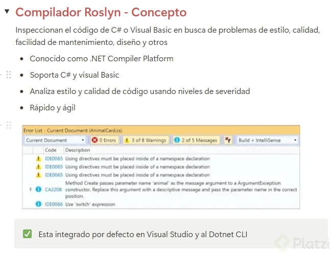- Facilidad de uso: Sin necesidad de instalaciones adicionales, Roslyn está listo para funcionar con Visual Studio y la CLI, facilitando la vida del desarrollador.