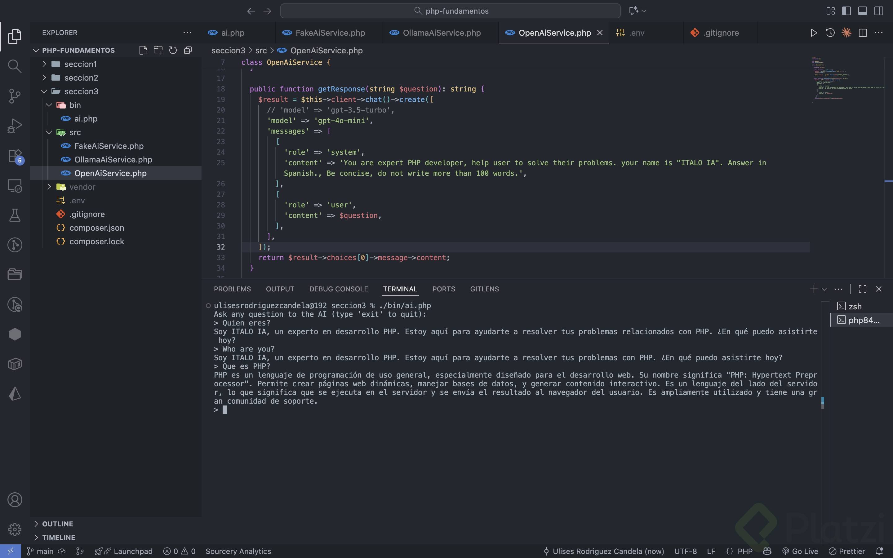 La instalación del componente necesario para conectar PHP con OpenAI es sencilla y similar a otras tecnologías integradas. Debemos utilizar la terminal para ejecutar el comando específico que nos facilita la documentación oficial del componente: