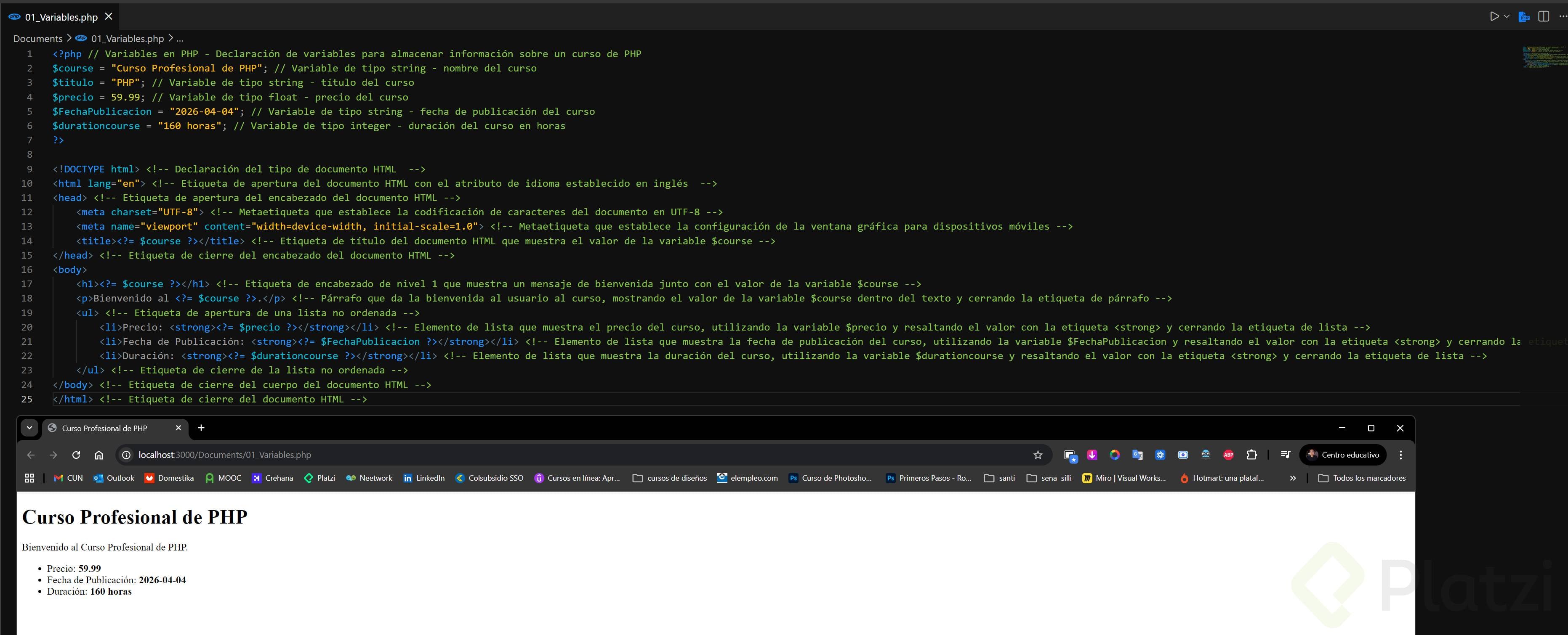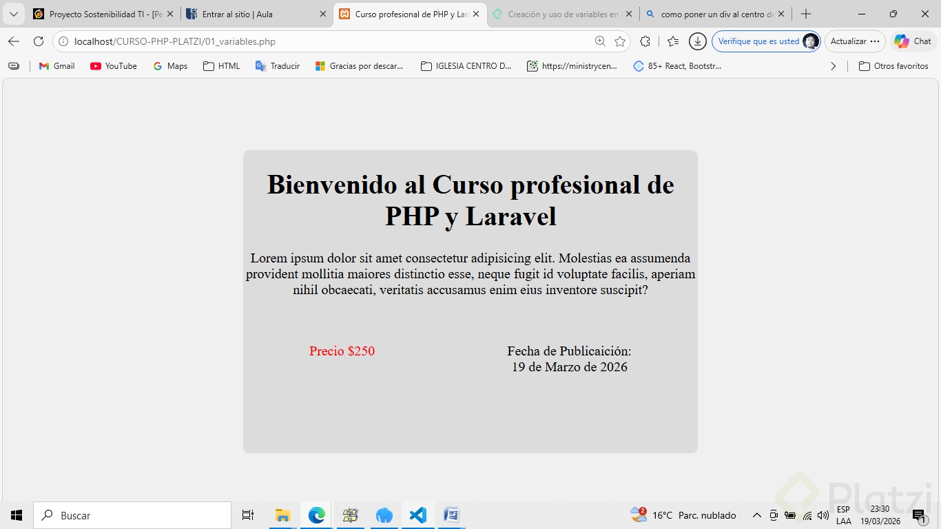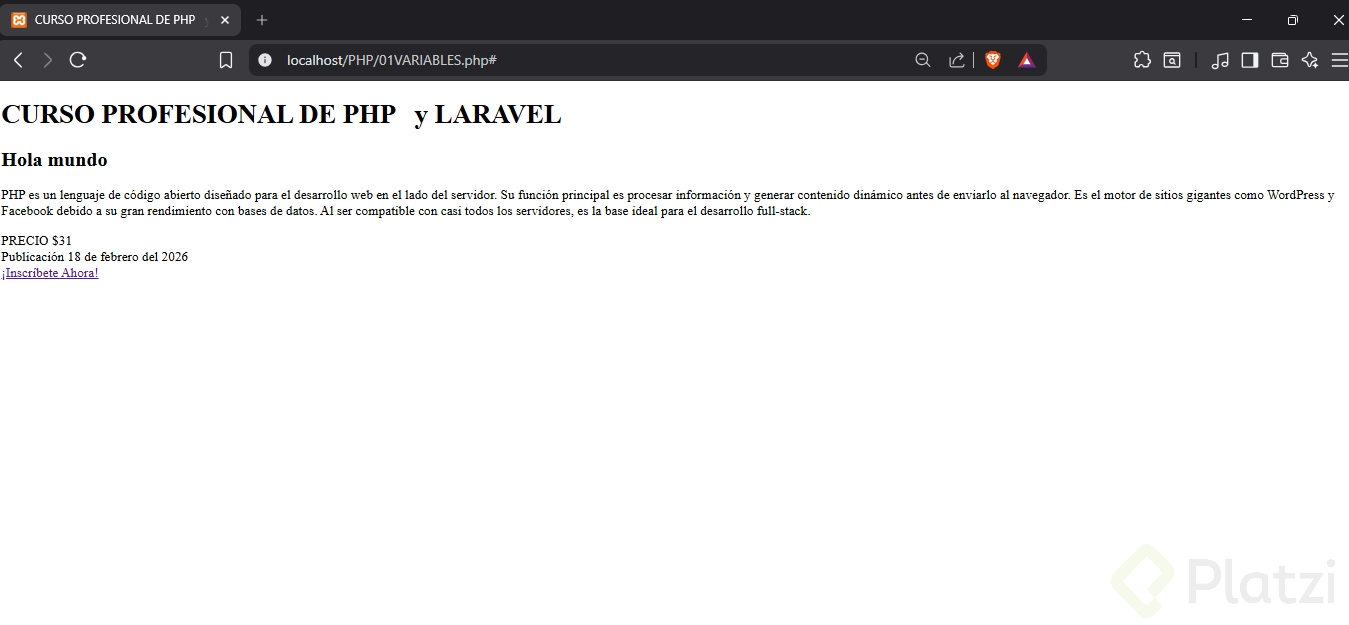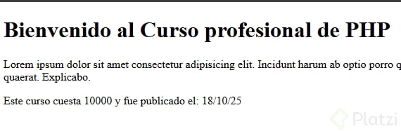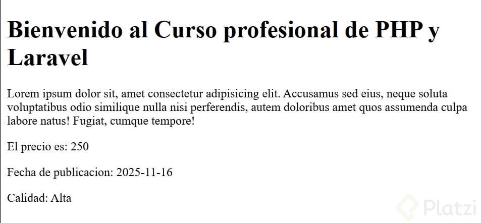<?php$titulo="Laravel";$precio=29.99;$fechaPublicacion="15 de octubre de 2023";?><p>El curso <?=$titulo?> cuesta <?=$precio?> dólares y fue publicado el <?=$fechaPublicacion?>.</p>
