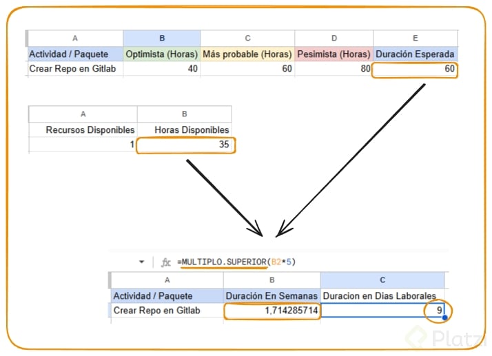 - Fórmula guía: duración = esfuerzo estimado / capacidad por unidad de tiempo.