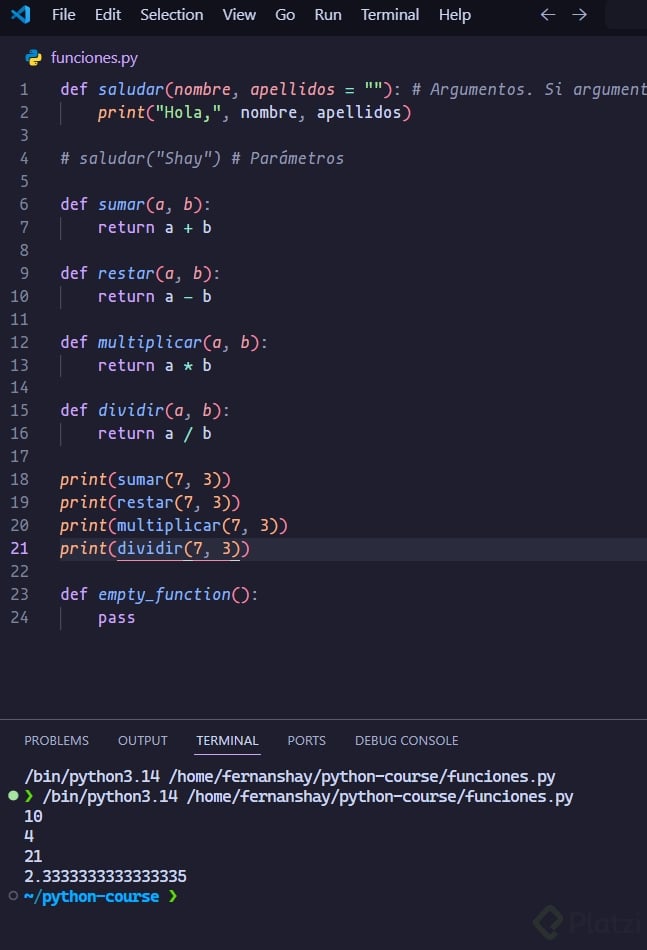 Domina las funciones en Python para escribir código claro, modular y reutilizable. Aquí verás cómo definir con def, invocar con paréntesis, personalizar con argumentos y parámetros, usar valores por defecto, devolver resultados con return y preparar funciones vacías con pass. Todo con ejemplos simples y directos.