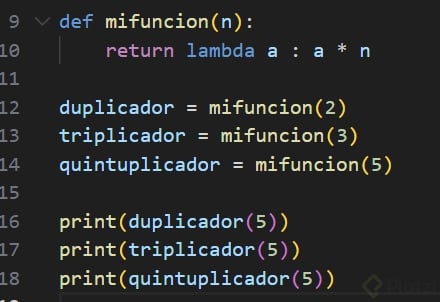 El punto fuerte mostrado: usar lambdas para fabricar funciones que aplican una operación parametrizada. Aquí, multiplicar por un número n para crear un duplicador o triplicador.